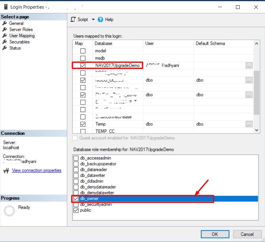 Setup user permission as db_owner in SQL Server as shown below.